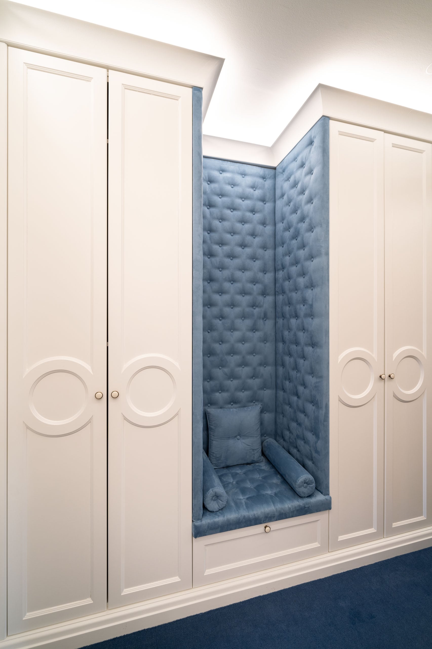 Die klassische Garderobe wurde mit dem Ziel gestaltet, den Charme der Wohnung zu unterstreichen. Hier wurden Rahmenfronten und indirekt beleuchtete Gesimse Leisten eingesetzt, um ein elegantes und zeitloses Erscheinungsbild zu erzeugen. Die edle Knopf – Polsterung zwischen den Hochschränken sorgt für eine angenehme Auflockerung und verleiht der Garderobe zeitlose Eleganz. Ornamentale Elemente verzieren die Schranktüren. Der Stil mit Rahmenfronten bzw. Rautenmuster zieht sich durch den gesamten Wohnraum – von der Garderobe bis hin zum neu gestalteten Schlafbereich.