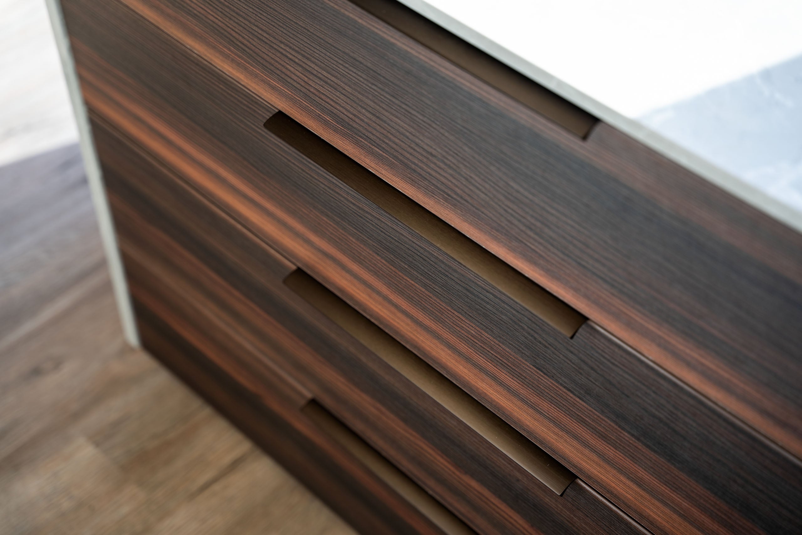 Durch den gezielten Einsatz von Storebeleuchtung werden die Strukturen und Muster des eingesetzten Makassarholzes hervorgehoben und schaffen eine angenehme Atmosphäre. Die Beleuchtung setzt die hochwertigen Produkte gekonnt in Szene und trägt somit maßgeblich zur stilvollen Präsentation bei.